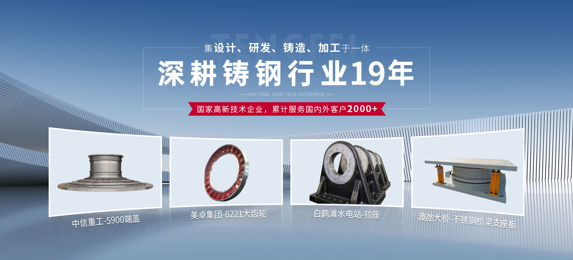 騰飛鑄鋼成立于2006年,位于全國鑄造基地河南省新鄉市,擁有員工300余人,是一家從事150噸以下碳鋼、低合金鋼、不銹鋼鑄鋼件研發、制造、服務為一體的國家高新技術企業。  公司通過了ISO9001國際質量管理體系認證,擁有2項發明專 利,2項河南省科技成果、25項實用新型技術,通過了“環保績效評級B級企業”驗收,先后榮獲“河南省鑄造行業綠色發展企業”、 “河南省科技型中小企業”、“河南省專精特新中小企業”等榮譽稱號?! 」緭碛?臺25噸電爐,4臺大型天燃氣熱處理爐、10米回旋自動拋丸機一臺, φ8m數控立車、φ10m數控滾齒機等各類高精裝備100余臺套,年產能3萬余噸,能為客戶提供從產品設計、木模加工、大型鑄造、大型加工一站式服務,產品廣泛應用于建材、冶金、鍛壓、冶金、水工、路橋、化工等多個重型行業?! ¢L期服務于中信重工、中船重工、美卓、上海中交、萊歇、寶武、濟南重工等全球知名企業,在行業內擁有較高的市場知名度和美譽度。